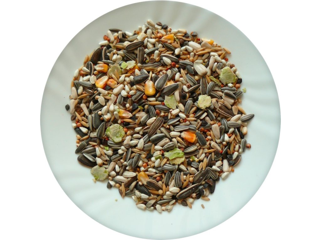 Krmný návod: Krmte podle potřeby. Zajistěte dostatek čerstvé pitné vody. Staré zbytky krmiv pravidelně odstraňujte. Doplňujte o čerstvé ovoce, zeleninu aj.Složení: slunečnice (žíhaná, bílá), safrol, oves bezpluchý, čirok (bílý, červený), pohanka, oves, kukuřice, hrachové vločky, proso červené, paddy rýže.Deklarované jakostní znaky: hrubý protein 15%, hrubá vláknina 8,5%, hrubé oleje a tuky 18,9%.