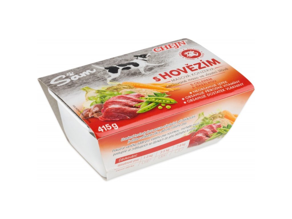 Kompletní krmivo pro psy všech plemen, lahodná masová konzerva s hovězím masem.