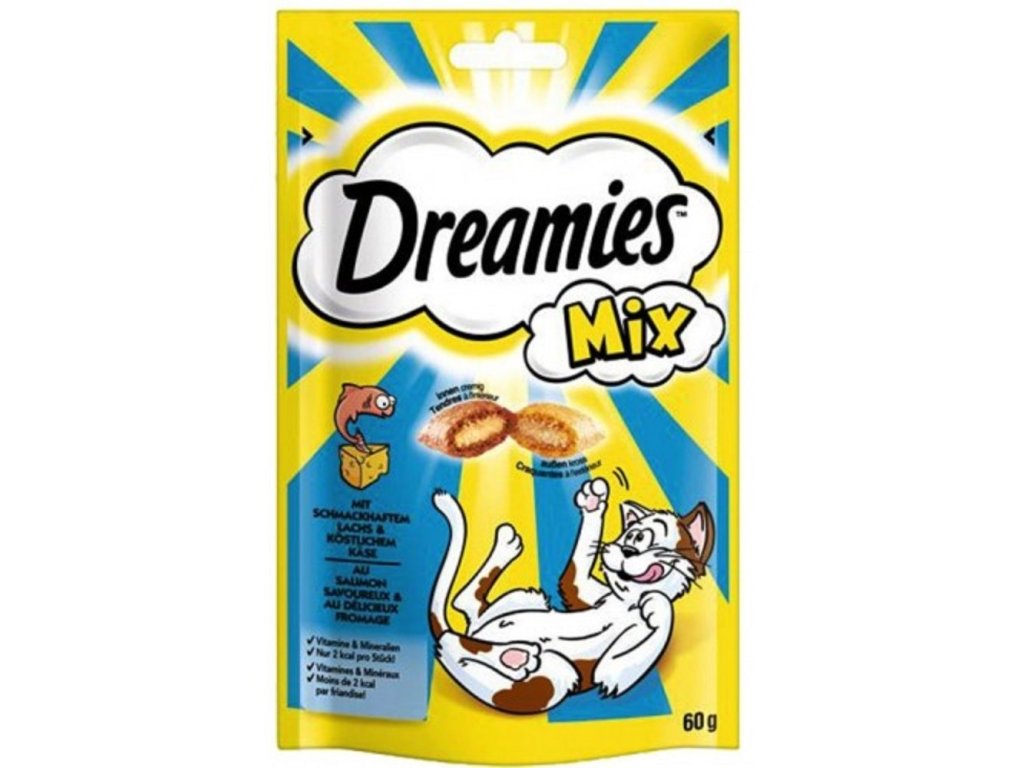 Doporučené dávkování: Dospělé kočce dejte nejvýše 20 kusů denně. Koťatům dejte nejvíce 6 kusů denně. Snižte odpovídajícím způsobem množství hlavního krmiva. Uchovávejte v chladu a suchu. Po otevření udržujte těsně uzavřené a spotřebujte do 4 týdnů. Čerstvá pitná voda musí být vždy k dispozici.Složení: maso a výrobky živočišného původu, cereálie, oleje a tuky, výrobky rostlinného původu, rostlinné bílkovinné extrakty, minerální látky, ryby a vedlejší produkty z ryb (včetně 4% lososa v oranžových granulích), mléko a vedlejší výrobky z mléka (včetně 4% sýra ve žlutých granulích).Analytické složky: protein 32%, obsah tuku 25%, obsah anorganických látek 9%, hrubá vláknina 1,7%, energie 438 kcal/100g.