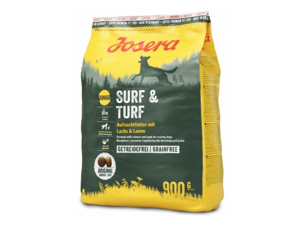 Receptura bez obilovin, bez umělých přísad, pšenice, sóji, cukru a mléčných výrobků s lososem a jehněčím masem. Díky vysoce kvalitním bílkovinám z jehněčího masa a lososa nabízí nové krmivo Josera Surf & Turf Junior rostoucím psům plnohodnotné a chutné menu pro každý den. Obsahuje všechny důležité živiny pro zdravý růst. Cenné mastné kyseliny a vitamíny ve snadno vstřebatelné formě podporují zdraví srsti a dodávají jí přirozený lesk. Umělá barviva, příchutě a konzervační látky jsou v této receptuře záměrně vynechány, aby si váš pes mohl vychutnat obzvláště přirozenou chuť. Tím je také zajištěna vysoká stravitelnost.