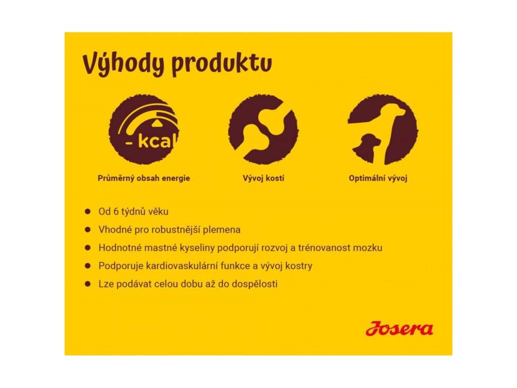 Josera Kids podporuje Vaše štěňátka od 8. týdne života v důležité dospívající fázi. Kvalitní přísady krmiva byly speciálně přizpůsobeny potřebám středních a velkých plemen psů s těžkou stavbou kostí. Optimální obsah vápníku a fosforu, dostatek vitamínu C, mangan a měď příznivě působí na vývoj kostry, silné kosti a zdravé klouby. Nižší obsah bílkovin a tuků podporuje stavbu svalové hmoty a v kombinaci s L-karnitinem zajišťuje, že se v těle příliš rychle neusazuje velké množství tuku. Společně s taurinem může L-karnitin podporovat zdravou funkci srdce. Vzhledem k tomu, že je toto prémiové krmivo vhodné i pro dospělé psy, můžou s ním být krmeni psi do dospělosti beze změny.Josera Kids neobsahuje žádná umělá barviva, aromata, konzervační látky, ani geneticky upravované suroviny. Jako většina produktů Josera Junior neobsahuje přísady, které mohou způsobovat alergie, jako jsou pšenice, cukr, sója nebo mléčné produkty. Kvalita všech přísad je neustále kontrolována. Kvůli zachování cenných vlastností, jsou granule baleny do praktického, znovuuzavíratelného sáčku AromaSafe.Josera Kids v přehledu:- krmivo pro štěňata středních a větších psích plemen od 8. týdne života- vyvinuto speciálně pro potřeby psů s těžší stavbou kostí- ideální obsah fosforu, vápníku, vitamínu C, manganu a mědi: podporuje stavbu kostry a kostí, stejně jako zdravé klouby- nižší obsah energie a bílkovin: přizpůsobená potřebám těžkých plemen ve fázi růstu, v kombinaci s L-karnitinem zajišťuje svalovou hmotu s nízkým obsahem tuku- s taurinem a L-karnitinem: přispívá k posilnění srdeční funkce- 100% bez barviv, aromat a konzervačních látek, bez genetických úprav- neobsahuje přísady, které mohou způsobovat alergie: pšenice, sója, cukr a mléčné produkty- vyrobeno v Německu: kontrolovaná kvalita ve vlastní laboratoři Josera- granule plné chuti: optimálně velké granule, které jsou vysoce akceptované- ochrana aroma: znovuuzavíratelný sáček pro zachování chuti a cenných živinSložení: sušený drůbeží protein, celozrnná kukuřice, rýže, řepné řízky, drůbeží tuk, hydrolyzovaný drůbeží protein, lososový olej 0,8%, minerální látky, kvasnice, prášek z cikorky (inulin), sušené maso novozélandských zeleno pyskatých mušlí (Perna canaliculus).