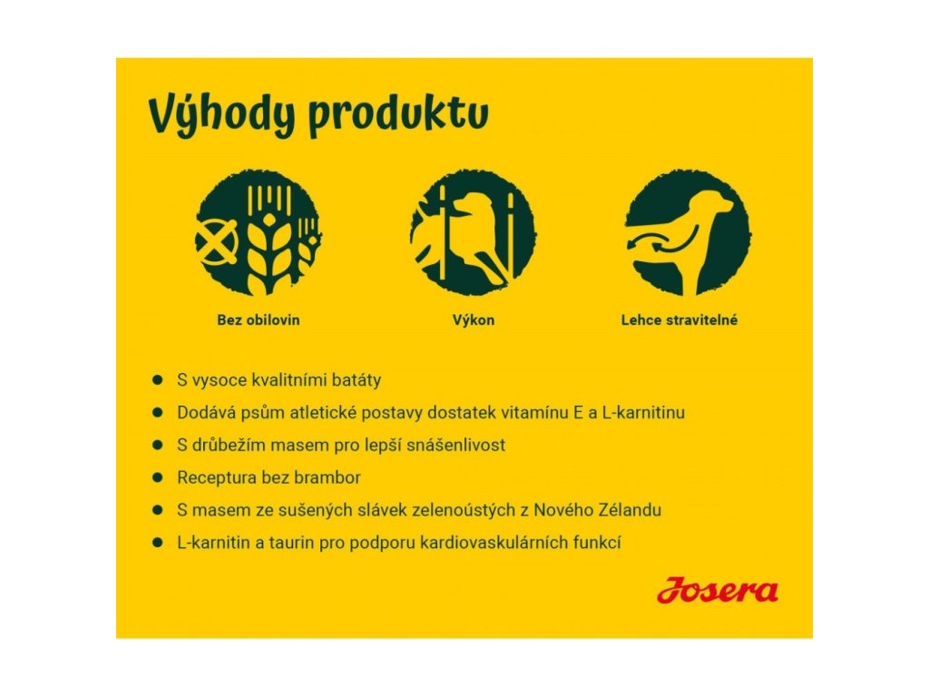 Josera Nature Energetic je to pravé krmivo pro vašeho sportovního čtyřnohého přítele! Receptura bez obilovin se sladkými bramborami a stravitelným drůbežím masem se vyznačuje obzvláště dobrou stravitelností. Bez přidané pšenice, sóji, cukru a mléčných výrobků.100% klimaticky neutrální výrobek. Tato receptura neobsahuje obiloviny a je vhodná pro každodenní výživu zdravých a citlivých psů. Cenné antioxidanty dokáží minimalizovat škodlivý účinek volných radikálů, které se ve zvýšené míře tvoří při fyzické aktivitě. L-karnitin podporuje metabolismus tuků a pomáhá dodávat energii. Použití vysoce kvalitních surovin bez genetického inženýrství