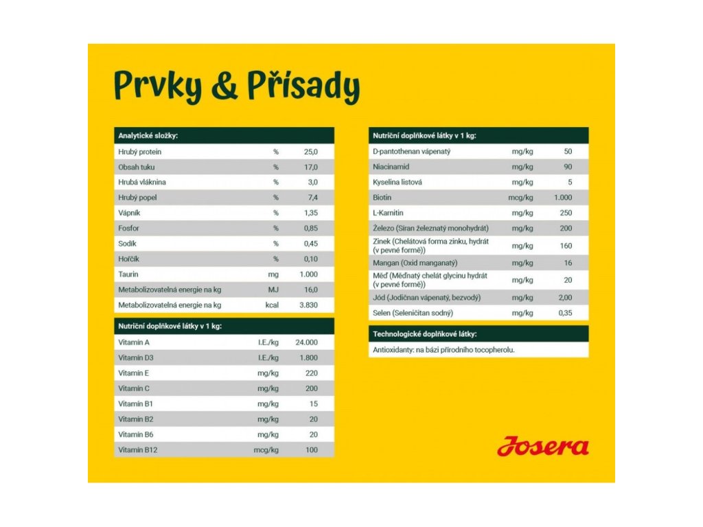 Josera Nature Energetic v přehledu: - Speciální krmivo bohaté na energii pro aktivní, sportovní psy - Bezobilninová receptura, vhodné také pro citlivé jedince trpící alergiemi či citlivým trávením - Bez brambor: sladké brambory slouží jako alternativní zdroj sacharidů- S lehce stravitelným drůbežím: zdroj cenných živočišných bílkovin, lehké a dobře stravitelné - S L-karnitinem: povzbuzuje látkovou výměnu a poskytuje dostatek energie- Obsahuje antioxidanty: s vitamínem E, neutralizuje volné radikály- Lehce stravitelné složení: prémiové suroviny a šetrné zpracování zajistí vysokou stravitelnost- S inulinem z čekanky: prebiotikum, harmonizuje střevní mikroflóru a optimalizuje vstřebávání živin - Se slávkou zelenoústou: pro zdravé klouby a zvýšenou pohyblivost- Vyvážené složení: obsahuje celou řadu cenných vitamínů, minerálních látek a stopových prvků, odpovídá nutričním potřebám aktivních psů - Vysoká snášenlivost: aromatické, lahodné granule z prvotřídních surovin- Vyrobeno v Německu: přírodní výroba, kontrolovaná kvalita díky vlastní laboratoři značky Josera - Bez: pšenice, sóji, GMO, umělých barviv, ochucovadel a konzervačních látek- Ochrana aroma: uzavíratelná kapsička chrání chuť a vůni a cenné živinySložení: drůbeží masová moučka, hrachová moučka, sladké brambory (batáty), drůbeží tuk, řepné řízky, sušený svatojánský chléb, drůbeží bílkovina (hydrolizovaná), minerály, kvasnice, jablečná vláknina, prášek z cikorky, sušené novozélandské zelenopyskaté mušle (Perna canaliculus)Deklarované jakostní znaky: protein 25%, tuk 17%, hrubá vláknina 3%, hrubý popel 7,4%, vápník 1,35%, fosfor 0,85%, sodík 0,45%, hořčík 0,10%.Doplňkové vyživovací látky na 1kg: Vitamín A 24.000 IE, Vitamín D3 1.800, Vitamín E 220mg, Vitamín B1 15mg, Vitamín B2 20mg, Vitamín B6 20mg, Vitamín B12 100mcg, kyselina pantothenová 50mg, niacinamid 90mg, kyselina listová 5mg, L-Carnitin 250mg, Taurin 1000mg, biotin 1000mcg, vitamín C 200mg, železo (sulfát železa, monohydrát) 200mg, zinek (chelát zinku glycin, hydrát) 160mg, mangan 16mg, měď (chelát měďnatý glycin, hydrát) 20mg, jód (jodičnan vápníku) 2,0mg, selen 0,35mg.Metabolizovaná energie*: MJ/kg 16,00Metabolizovaná energie*: kcal/kg 3830 Dbejte vždy na dostatek čerstvé pitné vody.
