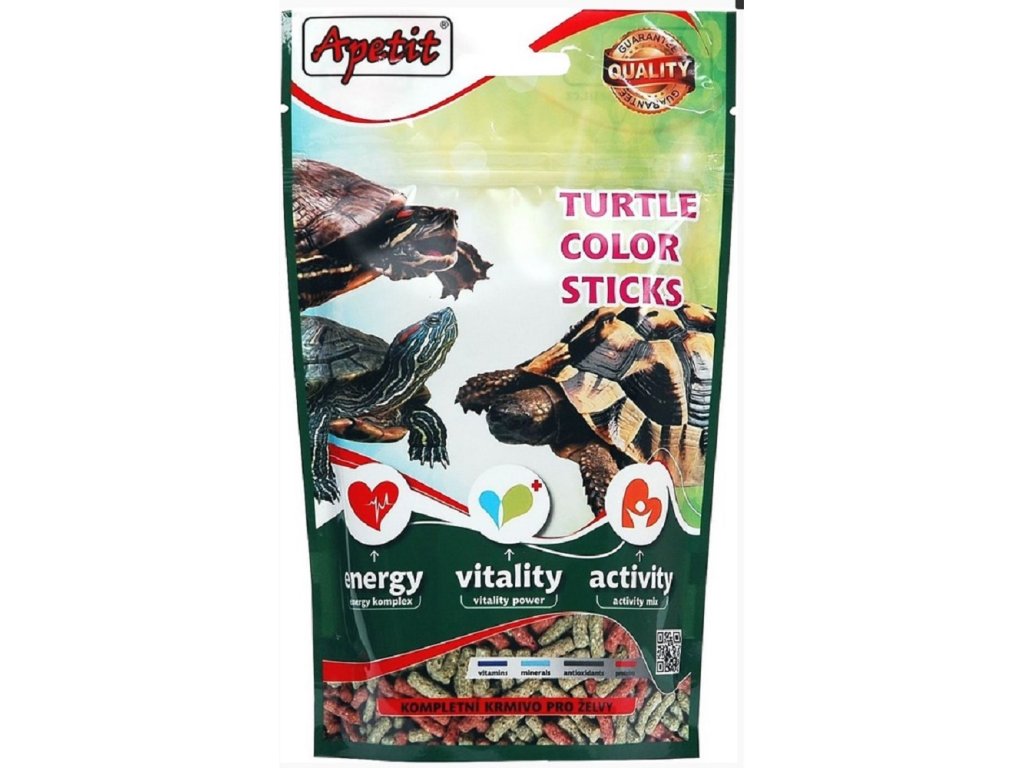 Krmný návod: podávejte krmivo několikrát denně podle potřeby a počtu želv, tak aby želvy krmivo spotřebovali do 15 minut. Složení: vedlejší výrobky rostlinného původu, obiloviny, bílkovinné extrakty rostliného původu, ryby a vedlejší výrobky z ryb, oleje a tuky, minerální látky, řasy, barviva, s antioxidantem-doplňkové látky ES.