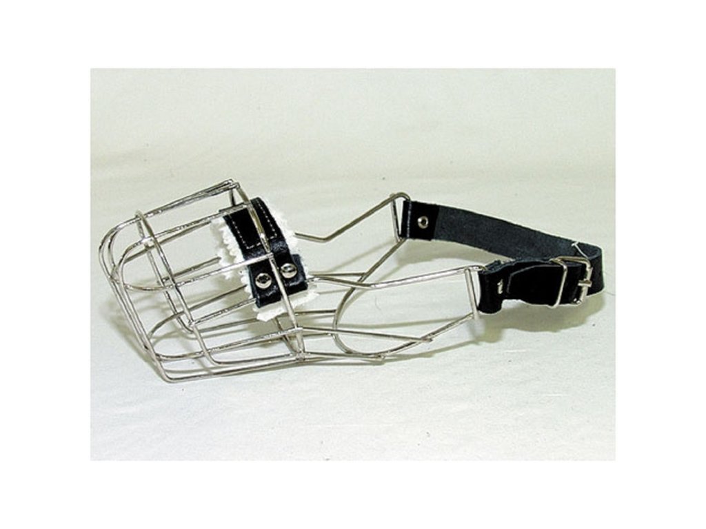 Kovový náhubek s koženými řemínky na zapínání pro fenu boxera.