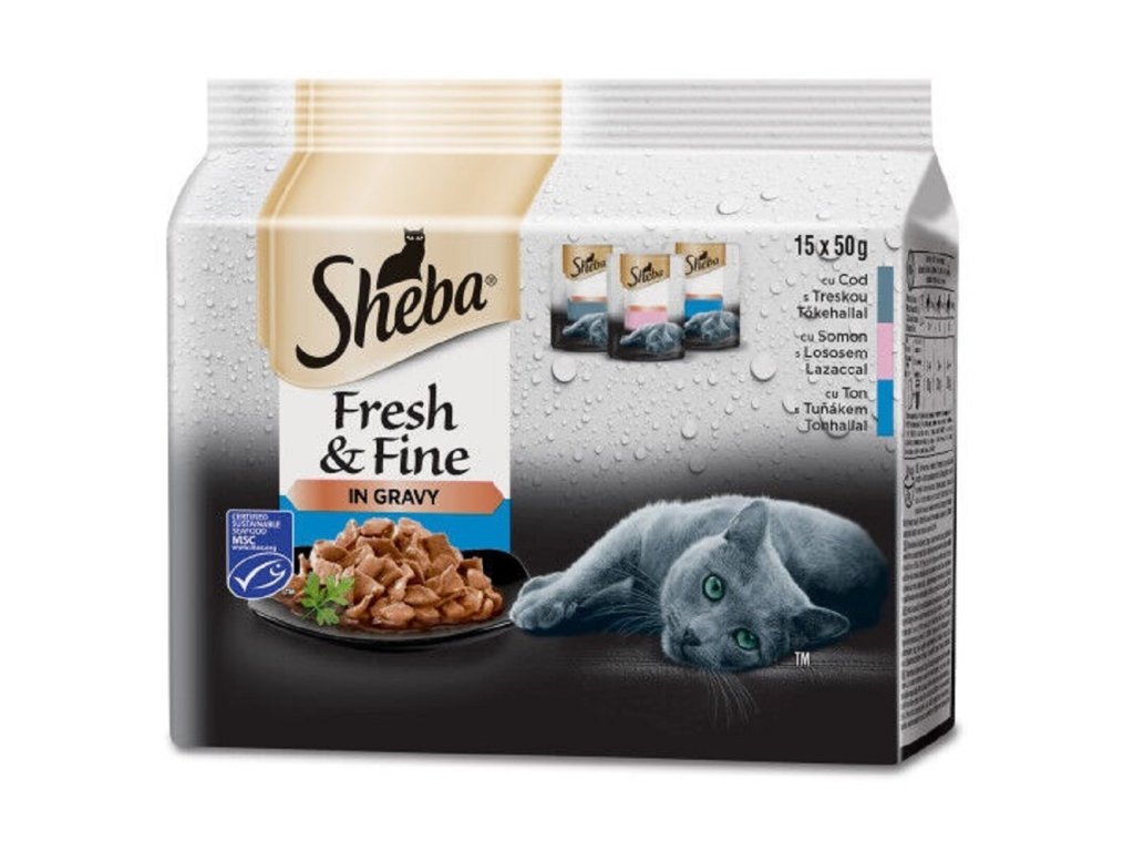 Kapsičky Sheba® Fresh & Fine s rybím masem v lahodné šťávě. Kapsička pro kočky s malými, na drobno nakrájenými kousky. Kompletní krmivo pro dospělé kočky, které splňuje veškeré jejich potřeby, uspokojuje jejich chuťové touhy a přináší jim radost. Krmivo je bez umělých barviv, konzervačních látek a aromat a představuje právě jednu čerstvou krmnou dávku.Obsah balení: 5x s lososem á 50g, 5x s tuňákem á 50g, 5x s treskou á 50gSložení:S lososem: maso a výrobky živočišného původu (40%), ryby a vedlejší produkty z ryb (včetně 4% lososa), obiloviny, minerální látky, různé cukry.S tuňákem: maso a výrobky živočišného původu (40%), ryby a vedlejší produkty z ryb (včetně 4% tuňáka), obiloviny, minerální látky, různé cukry.S treskou: maso a výrobky živočišného původu (40%), ryby a vedlejší produkty z ryb (včetně 4% tresky), obiloviny, minerální látky, různé cukry.Doporučené dávkování: kočka o hmotnosti 4 kg potřebuje denně 250g tohoto výrobku. Přizpůsobte krmnou dávku podle úrovně a tělesné kondice Vaší kočky. Čerstvá pitná voda musí být neustále k dispozici.Deklarované jakostní znaky: hrubý protein 8,00%, hrubý tuk 4,50%, hrubé anorganické látky 1,80%, vlhkost 83,0%, hrubá vláknina 0,30%Nutriční doplňkové látky v 1 kg: Jodičan vápenatý bezvodný 0,32mg, Síran měďnatý pentahydrát 4,9mg, Síran železnatý monohydrát 33,4mg, Síran manganatý monohydrát 6,3mg, Síran zinečnatý monohydrát 44mg