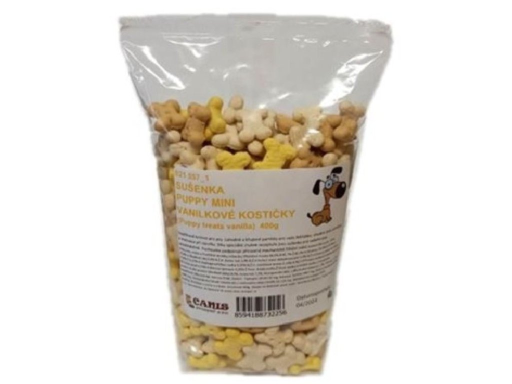 Lahodné a křupavé pamlsky pro vaše štěňátko, vhodné jako odměna a motivace při výcviku. Díky speciální chutné receptuře jsou sušenky pro vašeho psa neodolatelné. Pochoutka podporuje přirozené mechanické čištění zubů.Složení: obiloviny , cukry, tuky, maso a živočišné deriváty, minerály ( pšeničná mouka 66,0%-B 65,7%-Ž 65,2%-H, glukóza 25,0%-B 25,0%-Ž, 25,0%-H, řepkový olej 3,4%-B,Ž,H , kuřecí tuk 3,4%-B,Ž,H; kuřecí maso dehydratované 1,0%-B,Ž,H; chlorid sodný 0,67%-B 0,68%-Ž 0,67%-H; hydrogensiřičitan sodný 0,35%-B,Ž,H; vanilkové aroma 0,14%-B,%Z,H; přírodní smíšené tokoferoly 0,1%-B,Ž,H; karamel 0,74%-H; barvivo tartrazin 0,25%-Ž Analytické složení: hrubý protein (dusíkaté látky) 8,3%, hrubý tuk 7,5%, anorganické látky 1,8%, hrubá vláknina 1,7%, vlhkost 11,0%. Doplňkové látky (na kg): barviva FD&C žlutá 5 - Tartrazin 2A102 42 mg, karamel 2a150a 2467 mg, aroma: vanilkové aroma 1400 mg, Antioxidanty: extrakt tokoferolů z rostlinného oleje (1b306 (i)) 120 mg. Metabolická energie 3673 kcal/kg.Dbejte na dostatek pitné vody! Velikost: cca 2cm Pozn: B-bílá složka, Ž-žlutá složka, H-hnědá složka